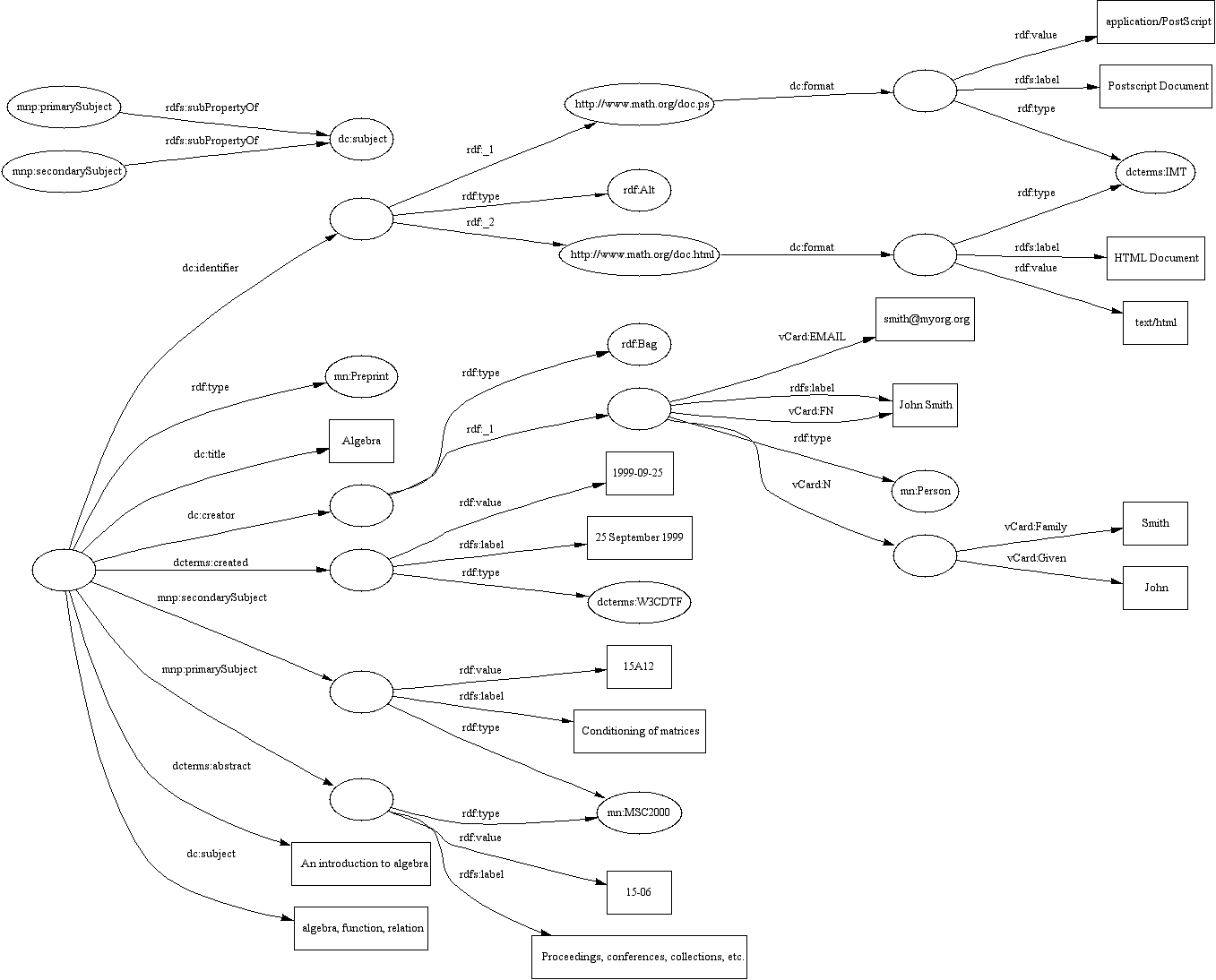 The declaration of dcterms:abstract as rdfs:subPropertyOf of dc:description in the example above ensures that for every dcterms:abstract arc a corresponding dc:description arc (with the same subject and object) is implicitly contained in the RDF.