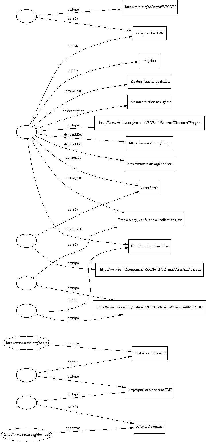 The following graph re-expresses unqualified DC in HTML in RDF in a schematic way. There is a tiny bit of extra information in the hedgehog model as opposed to HTML: all assertions made are about a fixed resource. (Throughout this document resources are indicated by a circle.) Content which is well-formed XML will be denoted with a square and addressed as literals.
